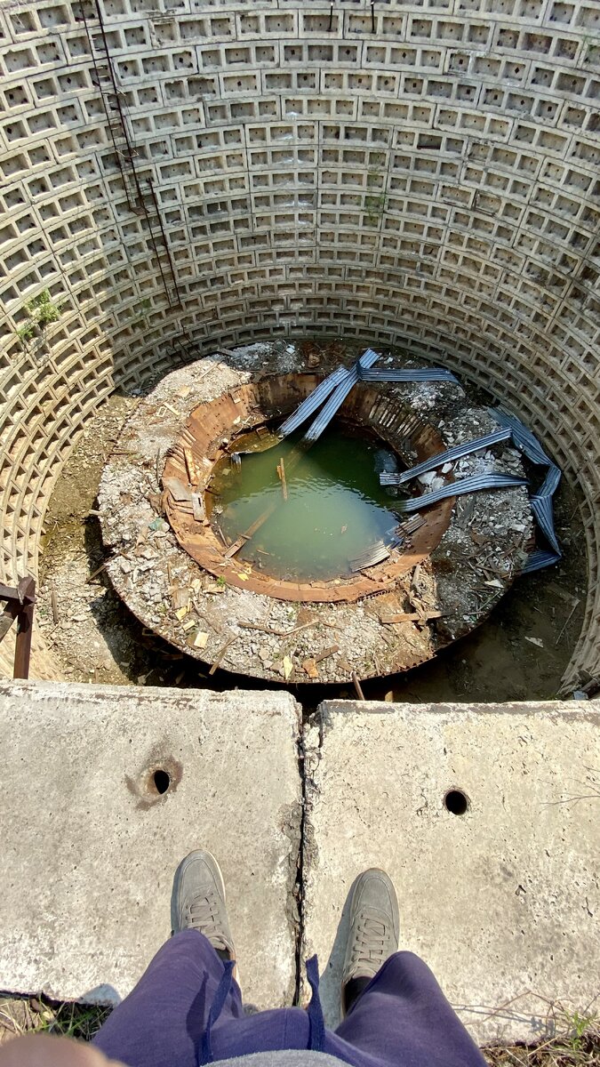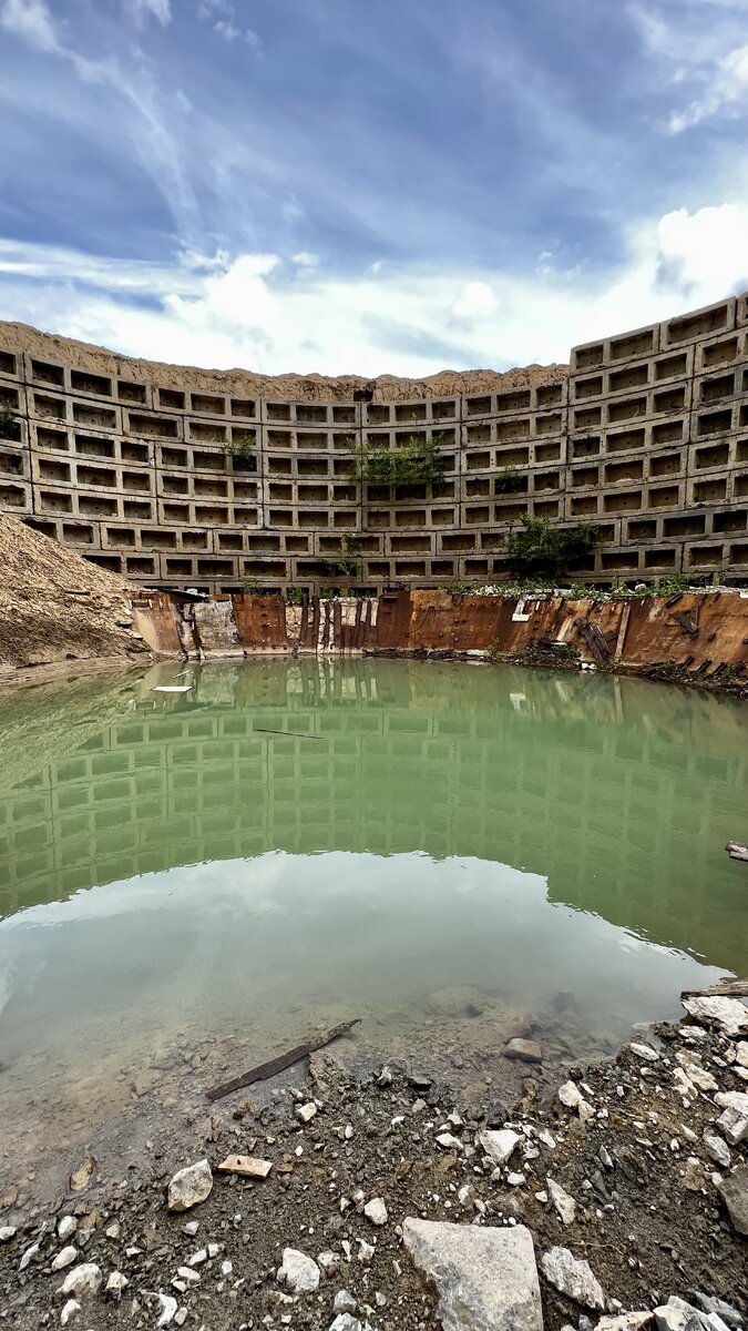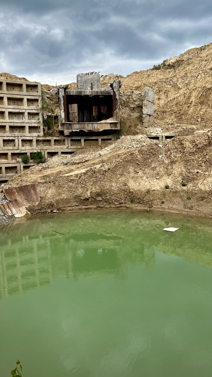 Зато я мог спуститься на дно кратера и посмотреть на остатки снизу. И даже на половину уже сломанный, он по прежнему оставался большим. Вода которая скапливалась внизу и уже образовала бассейн, имело почему-то ярко зеленый цвет, хотя по моему мнению от того количество металла внизу, она должна быть коричневая (ржавого цвета). На удивление строительной техники я не увидел, ну и людей тоже не было. Я пофотал и поехал дальше в Даниловский Пещерный Монастырь.