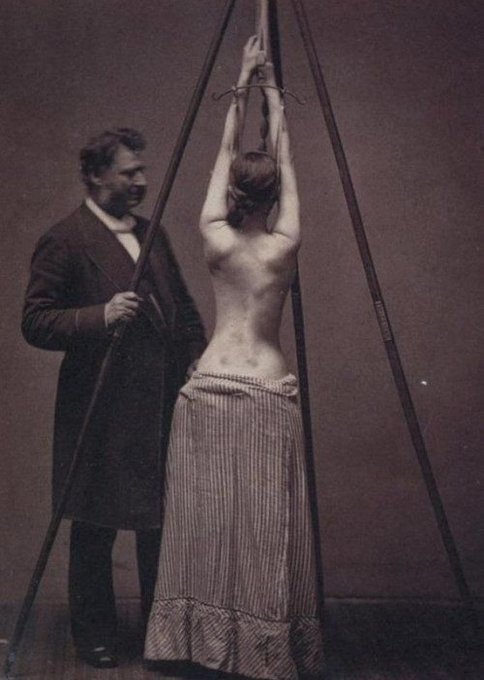 Нет, это совсем не то, что вы подумали. Просто врач осматривает женщину, страдающую сколиозом, XIX век.
