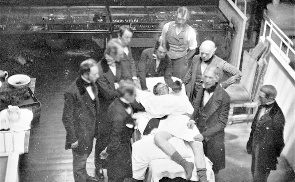 Заглянем теперь в операционную. Эти люди в смокингах — британские хирурги, готовящиеся использовать эфир — новый анестетик — на пациенте. На календаре 1847 год. До 16 октября 1846 года, когда хирург Джон Уоррен и дантист Уильям Мортон в первый раз усыпили пациента эфиром и успешно удалили ему опухоль, все операции делались без наркоза.
