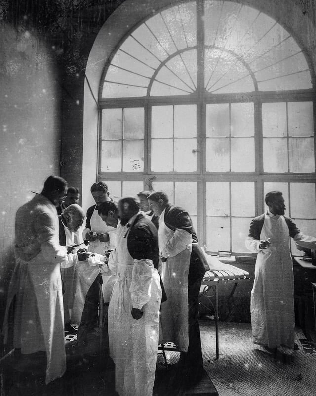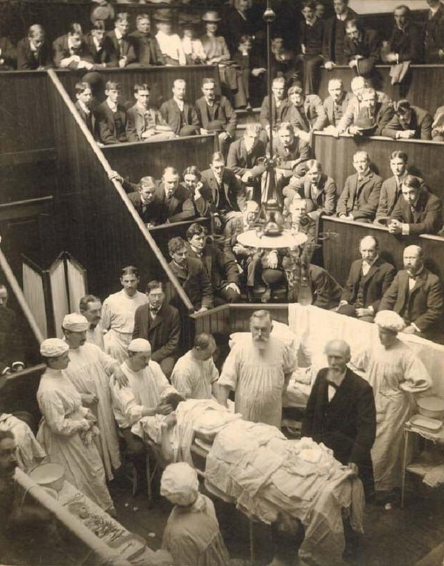 Если удивлены такой вопиющей с точки зрения современных требований к стерильности обстановкой, то вот вам чуть более позднее фото. Тут уже хотя бы кто-то в халате и в шапочке, но при этом полно зевак-зрителей. Поняли теперь, при чем тут «театр»?