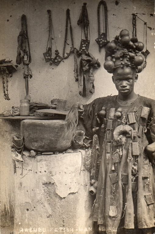 Тем временем где-то на другом конце света. Знахарь из Ганы, Африка, 1898 год. Бррр… Даже не спрашивайте меня, что это на нём вообще. Вернёмся же скорее, друзья, в мир научно-технического прогресса.
