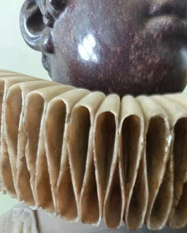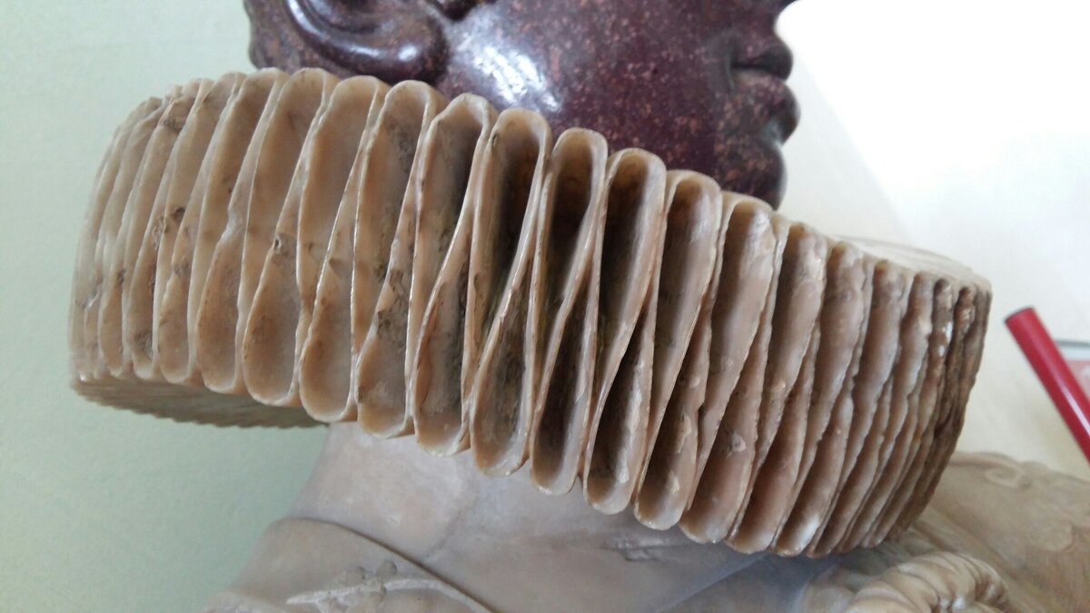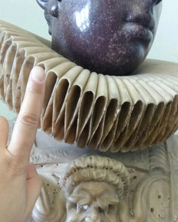 Материал – мрамор. Голова сделана из другой каменной породы. Любой камень – хрупкий материал. Как мастер смог выполнить полости внутри мраморного воротника? Даже имея современные фрезы и алмазный инструмент, существует большой риск что-то отколоть в работе.