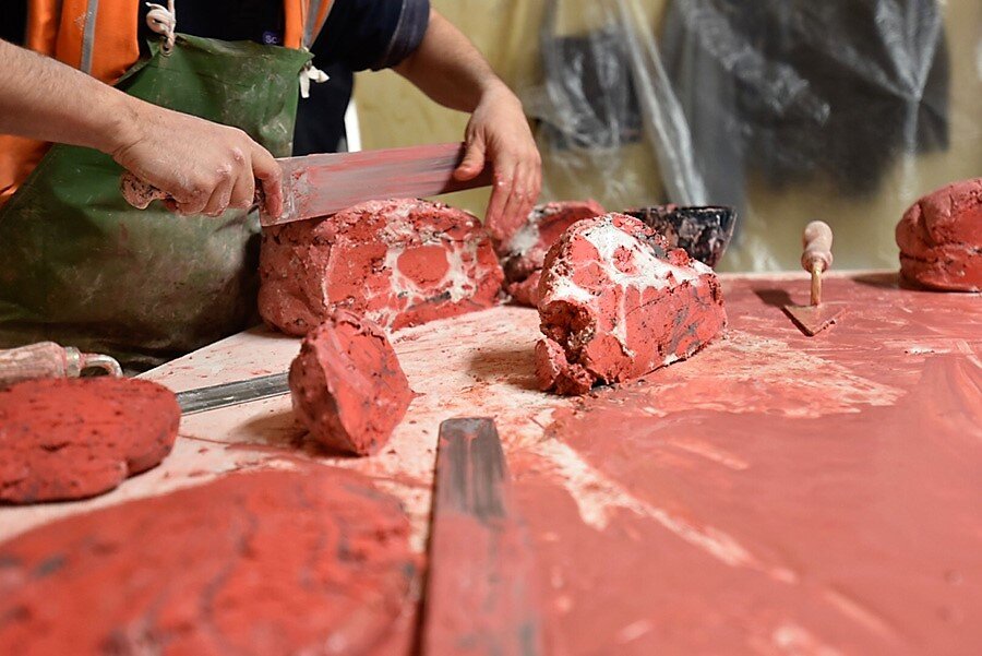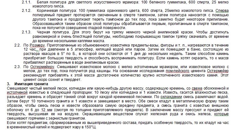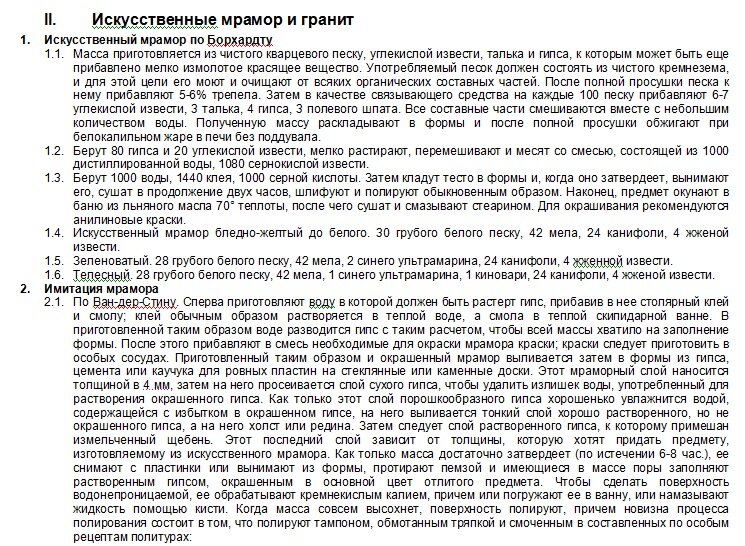 Основа этих рецептов – гипс и известь. В некоторых рецептах указано, что добавляется еще помпейский цемент. Помпейский! Значит, этим рецептам сотни лет и их могли использовать в древности для имитации мрамора. В наше время известен рецепт имитации мрамора, которым пользуются мастера-реставраторы под названием «Оселковый мрамор».