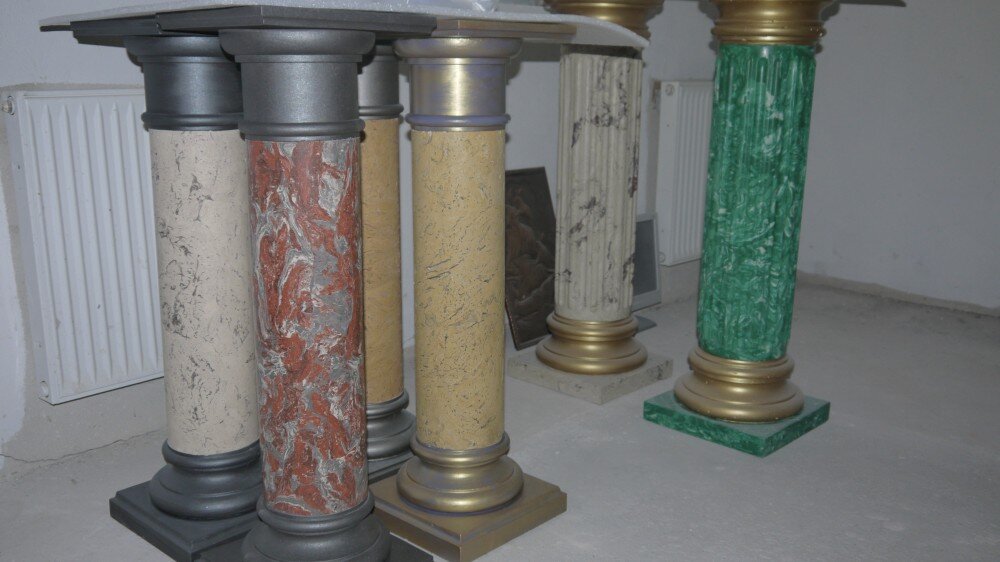 Более реальное объяснение может состоять в том, что это имитация мрамора. Делали состав, смесь, похожую на мрамор и которая набирала прочность как гипс. Таких рецептов в старых книгах для мастеров много. Несколько рецептов приведены в не таком уж и старом издании: «Справочник кустаря», издание — Бродерсен Г.Г., 1931 год. Ссылка