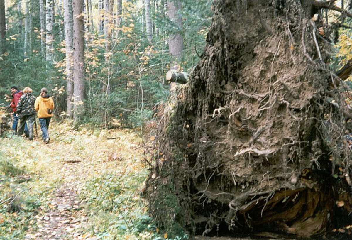 При ветровале у таких деревьев вырывается часть корня лишь с одной стороны, а та часть, в сторону которой дерево упало, остается в земле, не отделяясь при этом от ствола. И остается в состоянии натянутой пружины долгое время, иногда до несколько лет.