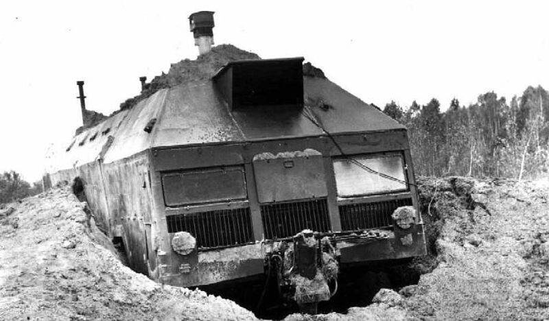 Самое интересное в конструкции – это система для ухода под землю. Правда, тут инженеры немного схитрили: для закапывания требовалась дополнительная спецмашина. Но зато какая продуманность: рядом с крышей были предусмотрены специальные окошки, которые оставались над поверхностью земли, а из кабины водителя выводился воздуховод – чтобы экипаж мог дышать, находясь под землёй.