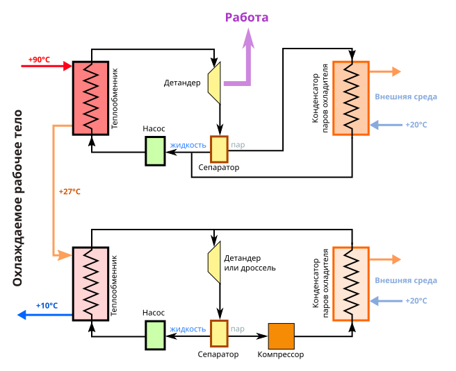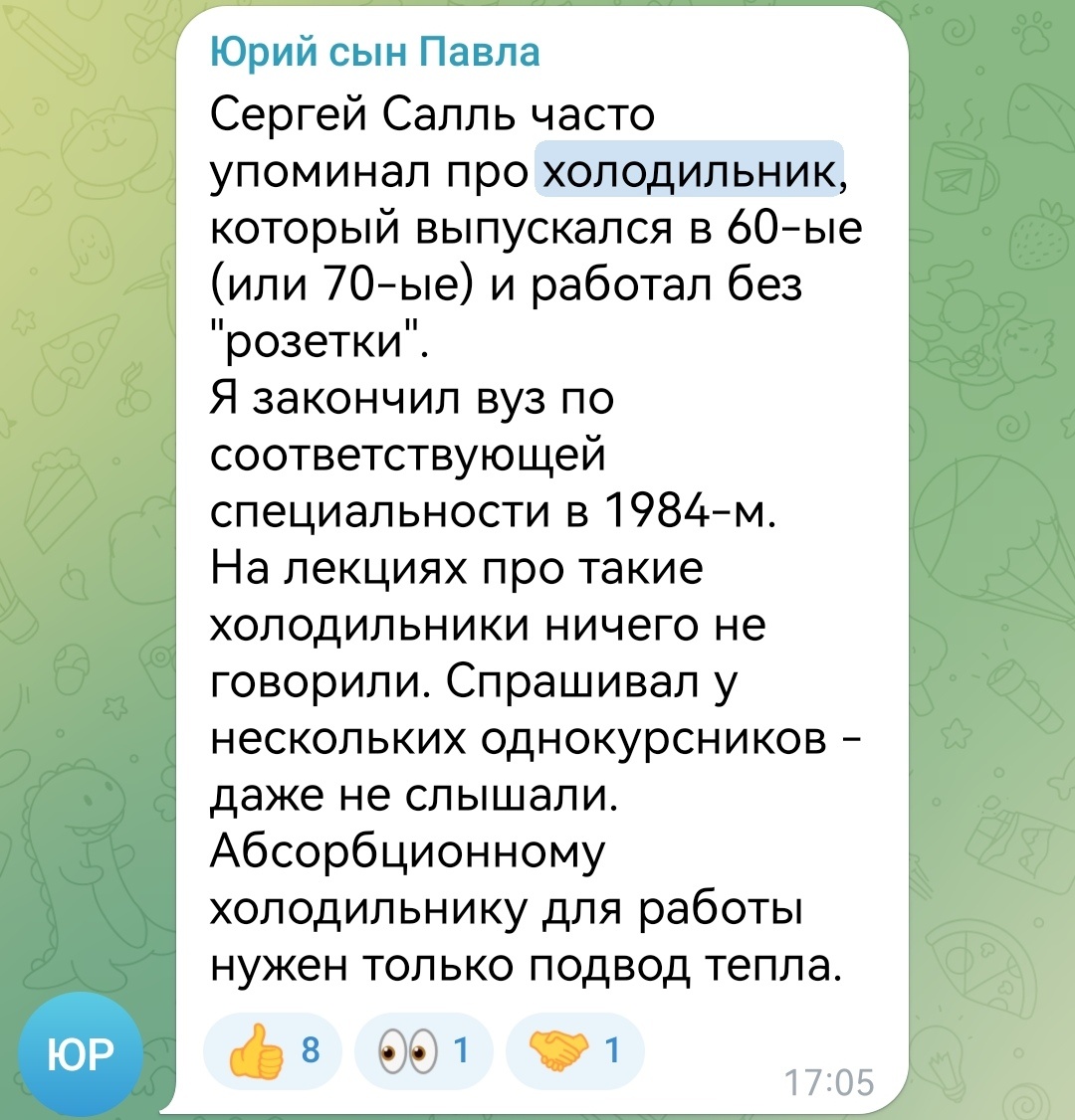 Примерно по такому же принципу работает аммиачный холодильник без компрессора, который тоже выпускала советская промышленность.