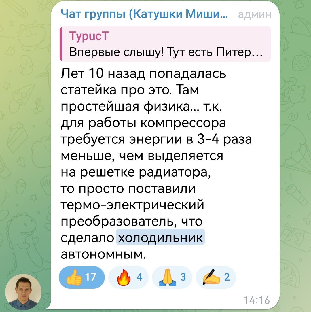 Получается принцип работы вечного двигателя, можно даже подсветку внутри холодильника на 3 Вт установить. Но откуда энергия для работы системы, компрессора? Из тепла. Тепло воздуха вокруг нас – это энергия, мы находимся в океане этой энергии. А манипуляция с ней позволяет получить автономно работающие тепловые устройства.